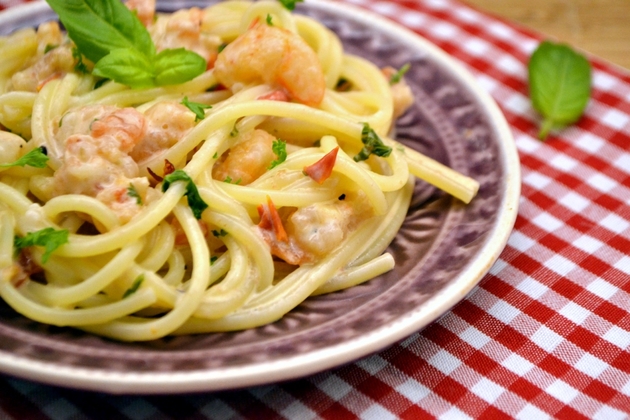 A szószhoz: 200 g konyhakész garnélarák, 1 közepes fej vöröshagyma, 2 gerezd fokhagyma, 2 db paradicsom, 0,75 dl száraz fehérbor, 2 ek olívaolaj, 1 dl főzőtejszín (15-20%-os), 6 db friss bazsalikomlevél, 2 csipet petrezselyemzöld, 1 csipet só, 1 csipet fekete bors, 1 csipet csili.